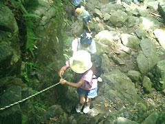 ![]() ロープを使って上ったり、岩をよじ登ったりして滝へ向かいます。 でもその途中ではいろいろな生き物や植物と出会って、観察しながら 進みます。 |