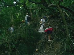 ![]() 滝を後にして、帰りはいよいよゴミ拾いです。 といっても、ツアー中にある程度拾っていたので ゴミは少なめ。でもよく見るとタバコや弁当のゴミなど レジャーゴミが見つかります。 滝でマイナスイオンをたくさん浴びたせいか、みんな 足どりがとても軽くなりました。 |