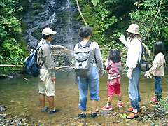 | 前半は自然体験のトレッキング! キツツキが木を突付く音が森に響き渡り、人に近寄ってくる小魚や 小さなかわいい花にも出会いました。途中では巨大なナメクジも! 足元の小さな生き物に目を向けながらも空を見上げると、やんばるの森に 息づく大木たちが僕達をゆったりと見つめているような気がしました。 |