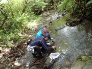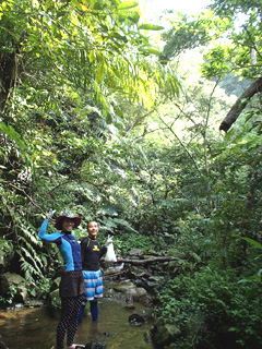 | 到着してすぐにジャングルの沢にザブンと入って上流を目指していきます。 ライフジャケットいらずの小さな沢ですが、水はサラサラとしていてとっても綺麗で 巨大なテナガエビをはじめ水辺の生き物たちにもたくさん遭遇できます。 前半は起伏が少なく緩やかなコースで浸かると気持ちいいミニプールが終点 後半は滝を目指して起伏のあるコースとなっており、年齢や体力に合わせて ゴール地点の調整も可能です。