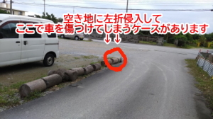 当店を出られたあとに、カーナビなどを設定するためにお店前の広い空き地に車を入れられるのは左側のブロックに乗り上げてしまう可能性がありとても危険です(運転中死角になり、とても見えづらいブロックです)。こちらの空き地にはお帰りの際に入らないようにお気をつけ下さい。