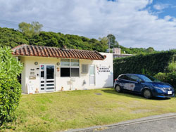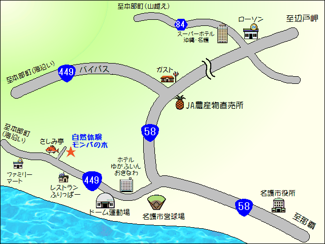 レストランふりっぱーとさしみ亭の間にあります(さしみ亭の斜め後ろ)名護市役所からは車で5分ほどです。