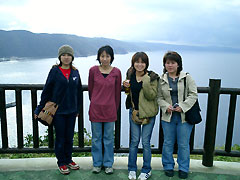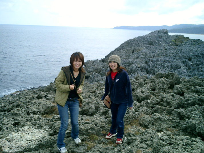 一行は更に北上を続けた。だんだん民家は少なくなり、切り立った断崖と大海原の景色が続いた。その景色は名護から大宜味までのものとは違う、雄々しい景観だった。やがてその断崖を一行の車は登り続け、茅打ちバンタにたどり着いた。ここは高さ70メートルに達する断崖で、「茅を投げ込むとそれを吹き上げるほど風が強い」ということからこの名前がついている。とはいうもののこの日は風も穏やかで、茅打ちバンタからの景色をゆったりと堪能することができた。しかし、ここでさなえが高所恐怖症ということが発覚。柵の側には近づくことはできなかった。たしかにものすごい断崖で真下の海は綺麗だが、吸い込まれてしまいそうな高さである。しかしユミとうおちゃんと和子はそんなこともお構いなしに、柵の端の先端まで行って下を見下ろしている!Ryuもさすがにこれはできなかった(良い子のみんなは決して真似しないように)。それにしても見事な景色だった。さらに空気が澄んでいる日に訪れれば絶景が期待されるであろう。