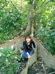 やがて森が開け、安波の集落にたどり着いた。ここも山間のとても静かな集落だ。本土の里の雰囲気とも共通するものが感じられる。この安波には、県の天然記念物にもなっているサキシマスオウノキがあるということで、そこを訪れた。この木は写真のように根っこが板状になっている、とてもユニークな南国の木だ。その横にはアコウの木がロープのような根っこを伸ばしている。亜熱帯の木々は生命力が形になって現れているものが多く、この木も一行に生きる力を示しているかのようだった。