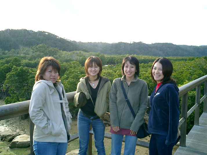 コーヒーファームを後にし、一行が向かったのは天然記念物にも指定されている慶佐次のマングローブ林だった。ここはカヌーを使ってマングローブ観察ができる場所でもあり、Ryuもかつてやんばる自然熟やホールアース自然学校のスタッフと共に案内をしていた場所でもある。すでに日は西に傾き、空はオレンジ色になりつつあったが、潮も引いていてマングローブ観察をするには好条件だったので、皆で木道を歩いてマングローブを間近に観察した。今回初めて慶佐次に来た仲間たちには、生き物の多い春〜秋にまたここを訪れて欲しいと思うRyuであった。