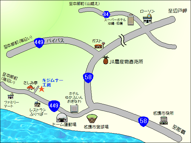| 那覇から車で約1時間半(高速利用) 名護市役所より車で5分 バスでお越しのお客様はやんばる急行バスか高速バス、路線バスで「名護バスターミナル」で下車してください。 名護バスターミナルから工房までの行き方はコチラの地図をご参照下さい。 |